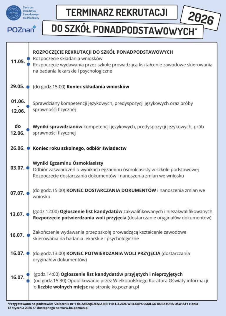 Centrum Doradztwa Zawodowego dla Młodzieży opracowało skrócony terminarz na podstawie dokumentu dostępnego na stronie Kuratorium Oświaty https://ko.poznan.pl/…/rekrutacj…/terminy_rekrutacja_ru/ (załącznik nr 1 – szkoły ponadpodstawowe i klasy wstępne) Źródło: