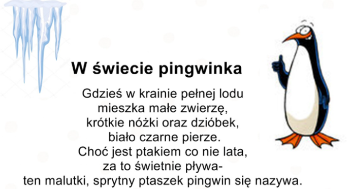 W grupie SIKOREK ten dzień obchodziliśmy w czwartek 22 stycznia. Dzieci podczas zajęć wzbogaciły wiedzę o życiu na Antarktydzie, poznały cechy charakterystyczne pingwinów, wiedzą w jaki sposób zdobywają pożywienie i chociaż są ptakami, są to nieloty, ale wspaniale pływają i nurkują. Przedszkolaki uczestniczyły w zabawach ruchowych: „dreptały jak pingwiny” przy piosence „Pingwinki”, nosząc jajo (woreczek gimnastyczny) na stopie, pokonywały sensoryczny tor przeszkód i nurkując w morskiej głębinie (przechodząc przez gimnastyczny tunel). Na koniec dzieci wykonały piękną pracę plastyczną – pingwiny wyglądały jak prawdziwe.