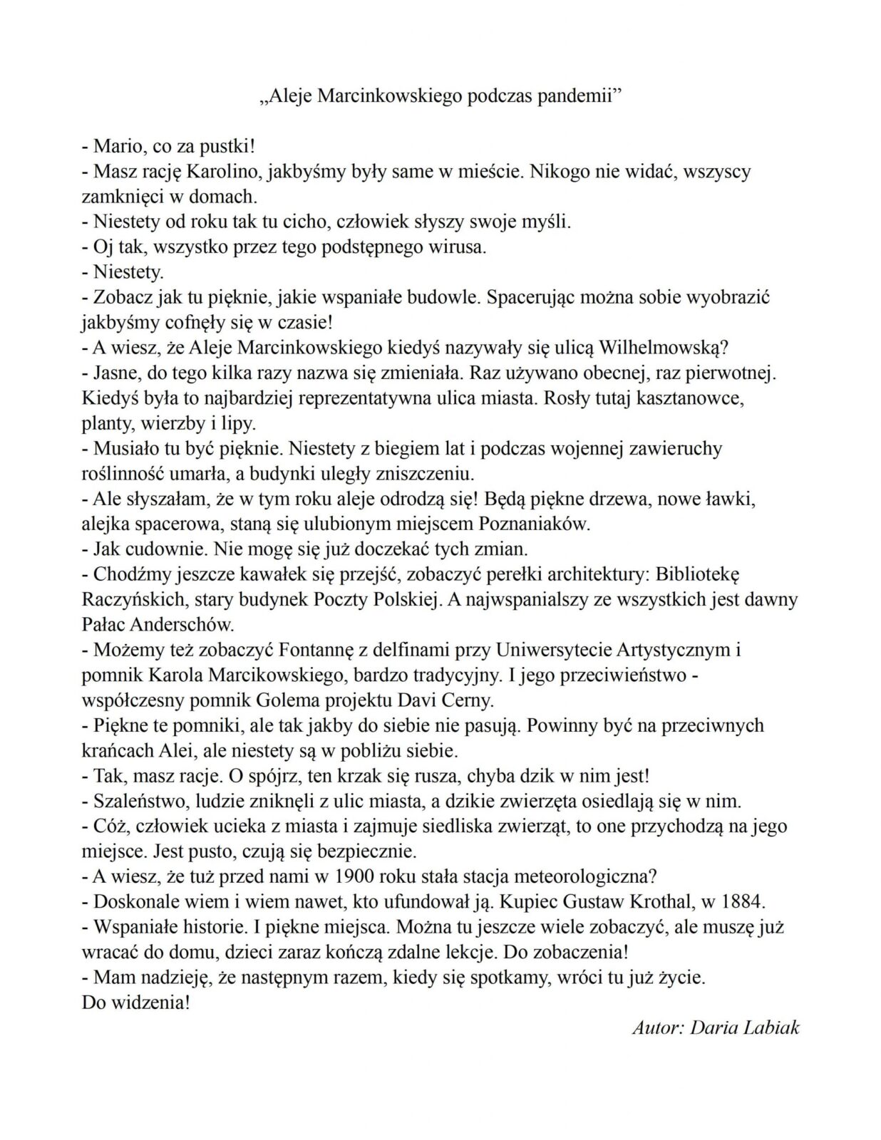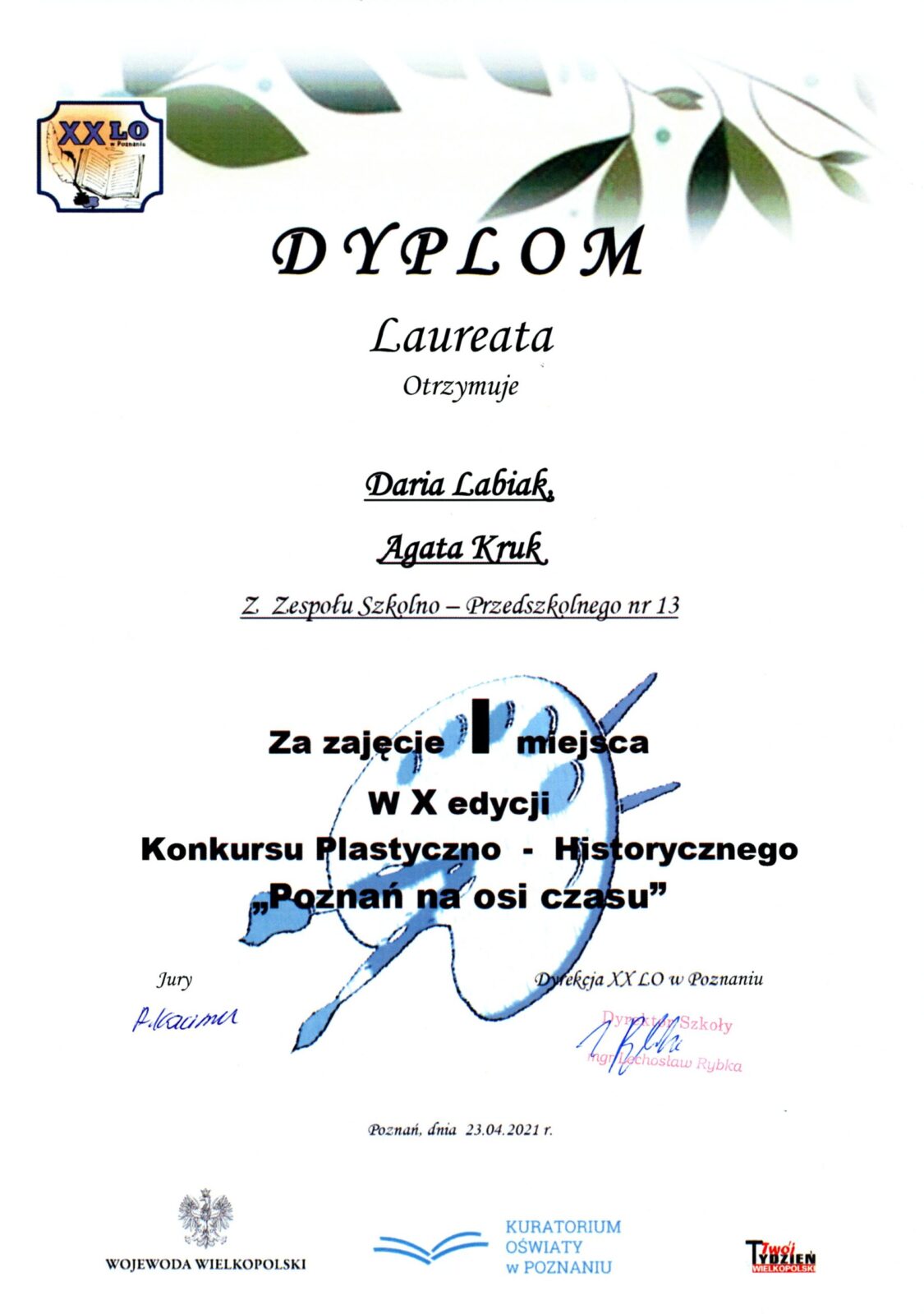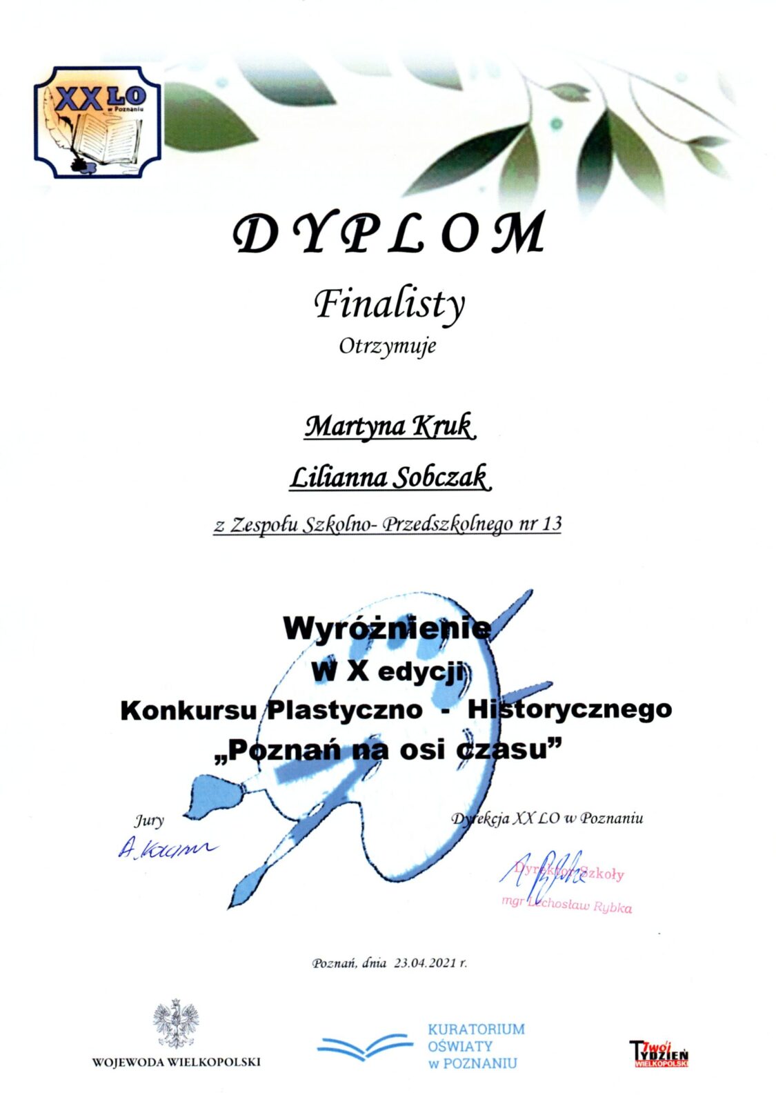 W dniu 23.04 br., w XX Liceum Ogólnokształcącym w Poznaniu ogłoszono wyniki X edycji konkursu plastyczno- historycznego ” Poznań na osi czasu” pod hasłem Spacer ulicami miasta – konkursu pod patronatem Wielkopolskiego Kuratora Oświaty oraz Wojewody Wielkopolskiego. Konkurs, jak również gala rozdania nagród z oczywistych względów odbyła się online. Spośród 5 dwuosobowych zespołów uczestników konkursu, z naszej szkoły następujące zespoły zostały nagrodzone i wyróżnione: