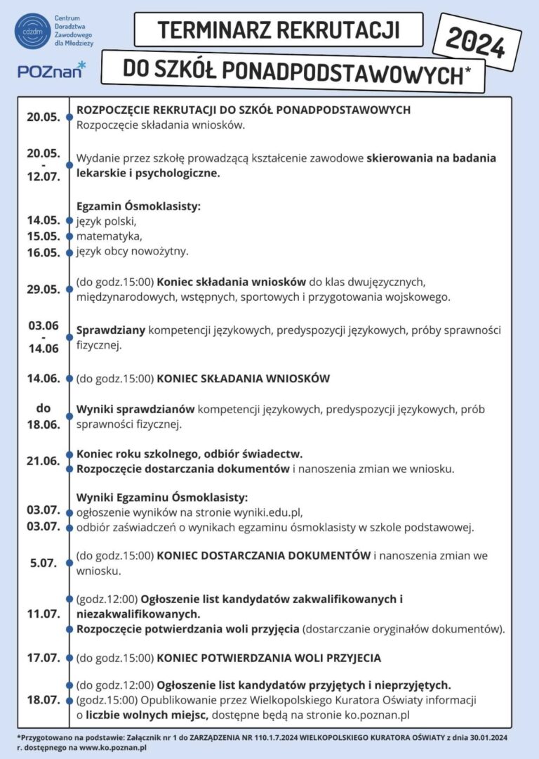 Terminarz został opracowany przez zespół Centrum Doradztwa Zawodowego Młodzieży na podstawie dokumentu: „Załącznik nr 1 do ZARZĄDZENIA NR 110.1.7.2024 WIELKOPOLSKIEGO KURATORA OŚWIATY z dnia 30 stycznia 2024 r., który jest opublikowany na stronie www.ko.poznan.pl